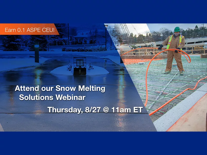 Watts will host a customer webinar, "Snow Melting Solutions," on Thursday, Aug. 27 at 11 a.m. EDT. This is the next installment in the Watts Works Engineer Webinar Series geared specifically towards engineers, architects, designers, specifiers, and facility managers.