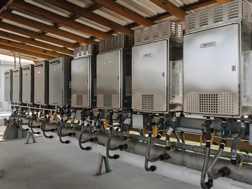 For example, if a building is operating at 30 percent capacity with a three-tankless water heater system, only one would be firing while the other two remain idle. Alternatively, if the building is operating at 100 percent capacity, all three units would fire to meet peak hot water demand.