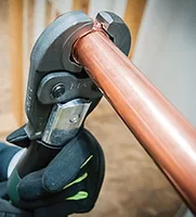 Designed for joining pipe safely by eliminating the need for an open flame and a hot work permit on the jobsite, this product features two separate tool platforms: the inline battery pressing tool (INLNPRESS-TOOL19kN) and the pistol grip battery powered pressing tool (PSTLPRESS-TOOL32KN). Both tools press watertight connections in three to four seconds and can be used while a system is still wet, so the contractor does not have to drain the system and wait for it to dry before pressing. The inline pressing tool has a fitting capacity of 1-1/2" (38.1mm) on PEX and 1-1/4" (31.8mm) on copper and stainless steel, and the pistol grip pressing tool has a fitting capacity of 2" (50.8mm) on PEX and 4" (101.6mm) on copper and stainless steel. The tools have a patented twist and release pin. The kits come with four jaws for the inline and six for the pistol grip. These pressing tools are designed with autostop technology, which automatically stops the piston when the optimal force is reached.