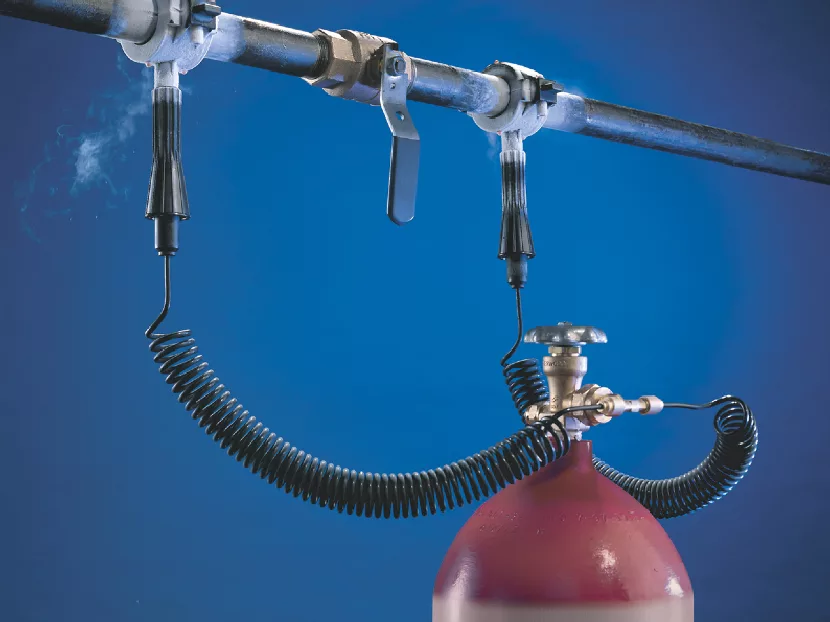 The Cold-Shot Pipe Freezing Kit from General Pipe Cleaners lets users repair an operating water system without draining lines, sprinkler arrays, or hot water systems, before cutting pipe or tubing. Using Carbon Dioxide (CO2) in dip-tube cylinders, the Cold-Shot freezes liquids in steel, copper, cast iron, aluminum, or plastic pipes — 1/8-inch through 2 inches in diameter — in minutes. Safe and easy to use, simply place the freeze head around the pipe, attach the hose, and open the CO2 cylinder valve. Liquid CO2 flows into the Cold-Shot freeze head, forming an ice pack in the line capable of withstanding 7000 psi.