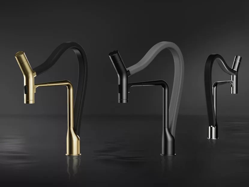 A magical moment happens when design interrupts our psyche and allows us to see a functional product in a new light. The latest faucet introduction from HamatUSA does just that. The new KANTA Dual Function Kitchen Faucet transforms the flow of water into something outright futuristic. KANTA's signature sweeping shape was created by Ronen Joseph Design Studio for HamatUSA. The juxtaposition of select PVD finishes against the soft silicone sleeve is the embodiment of intuitive design. The unique one-hand operation of KANTA has an extendable reach that makes it a natural choice for today’s modern chef kitchens. Crafted from solid brass, the faucet features a push button activation, integral rotating dial for temperature control, and a dual-spray.