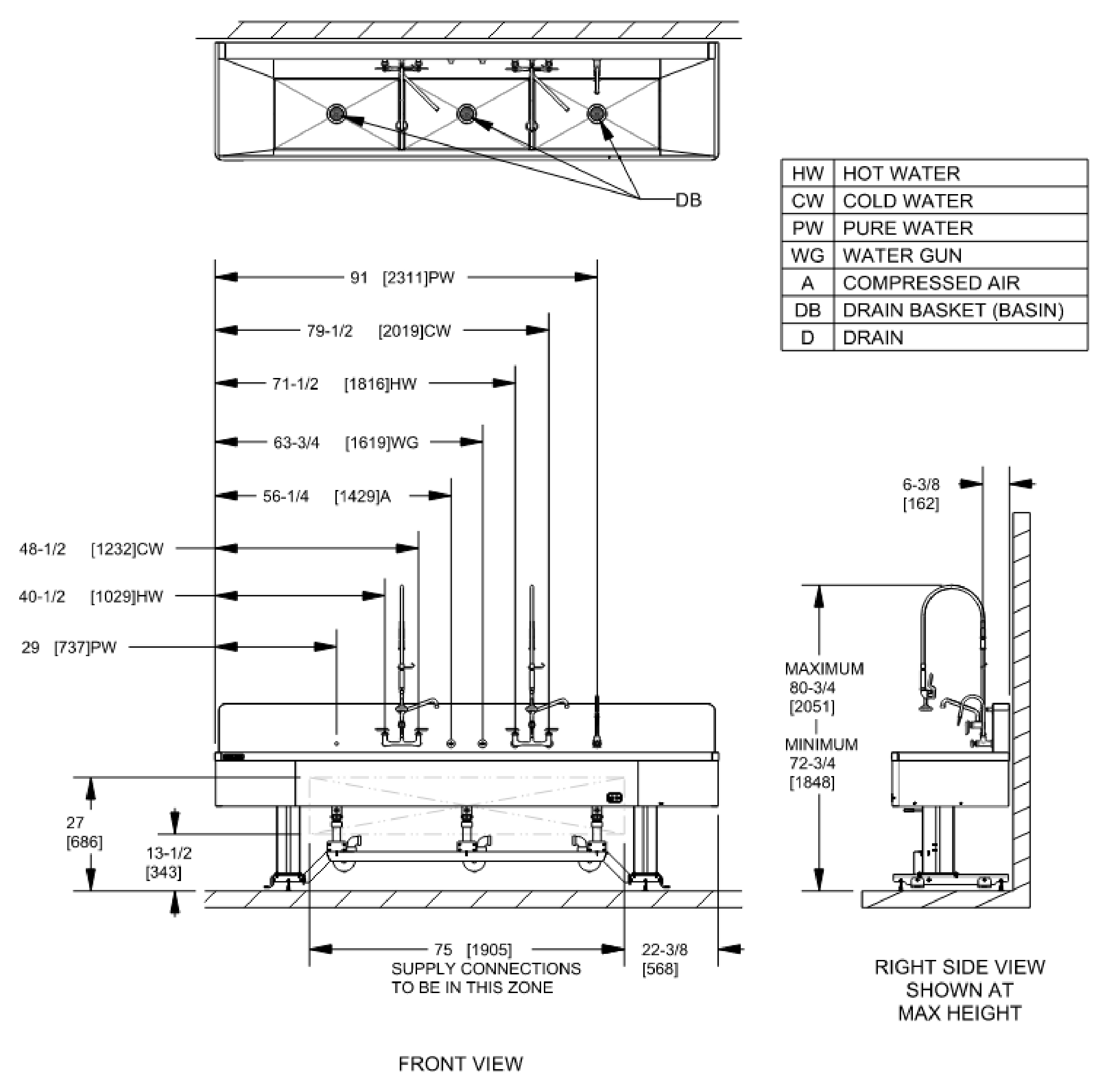 Sinks may be equipped with different combinations of the options shown in Figure 3, depending on user workflows and preferences. Most users prefer at least two sink basins (one for dirty wash water and another for a mix of clean water and detergent). A third basin may be present as well for a final rinse in purified water.