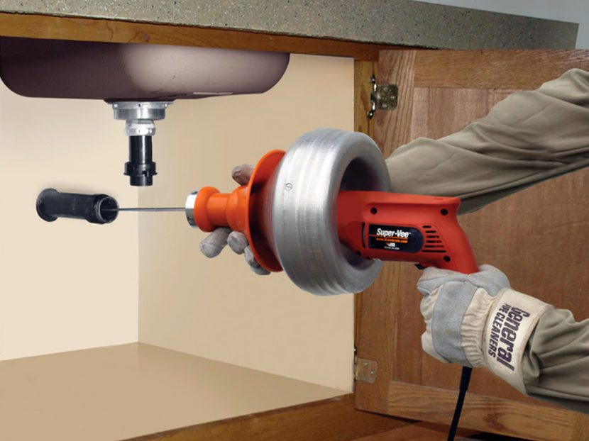 General Pipe Cleaners' hand-held Power-Vee drain cleaner with automatic feed makes clearing small drain lines fast and easy. The simplified feeding system gives savvy plumbing, drain cleaning, maintenance, and rehab pros an 'extra hand' in tight and awkward places. Just squeeze the lever and cable feeds at up to 16 feet per minute. The rugged, reliable Power-Vee easily unclogs sinks, tubs, and laundry drains from 1-1/4 inches to 3 inches in diameter, up to 50 feet long. General's automatic feed quickly adjusts to Flexicore cable from 1/4-inch to 3/8-inch diameters without special tools or additional parts. The compact Power-Vee features quick-change cable cartridges for fast cable changing or cleaning. And the Dyna-Thrust bearing system helps extend tool life by reducing bearing wear.