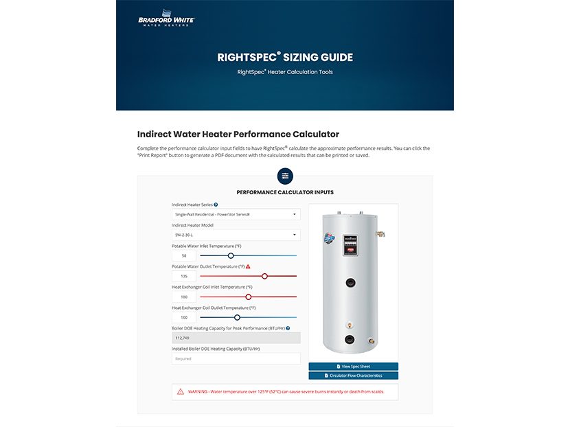 Bradford White’s RightSpec Product Sizing Tool with the new performance calculator helps the technician provide the customer with the best fit to meet this simple goal. Technicians, contractors and anyone else using it can be assured that they are specifying it right the first time.