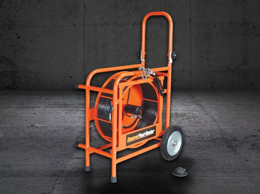 General Pipe Cleaners has rethought high-speed, flexible shaft drain cleaners with the new Flexi-Rooter 100, the next generation flexible shaft machine. Rugged and reliable, Flexi-Rooter 100 offers a stronger flexible shaft with the strength to cut through roots in 4-inch lines yet flexible enough to negotiate 2-inch lines; integral variable speed motor with foot pedal to allow you to use both hands to safely guide the flexible shaft into the line; and two-part cleaning array that combines unique ClogChopper cutters with carbide chain cutters for a formidable combination. Flexible shaft technology is faster and more thorough than conventional cable drain cleaners. The shaft spins more than 10 times faster than drum machines.