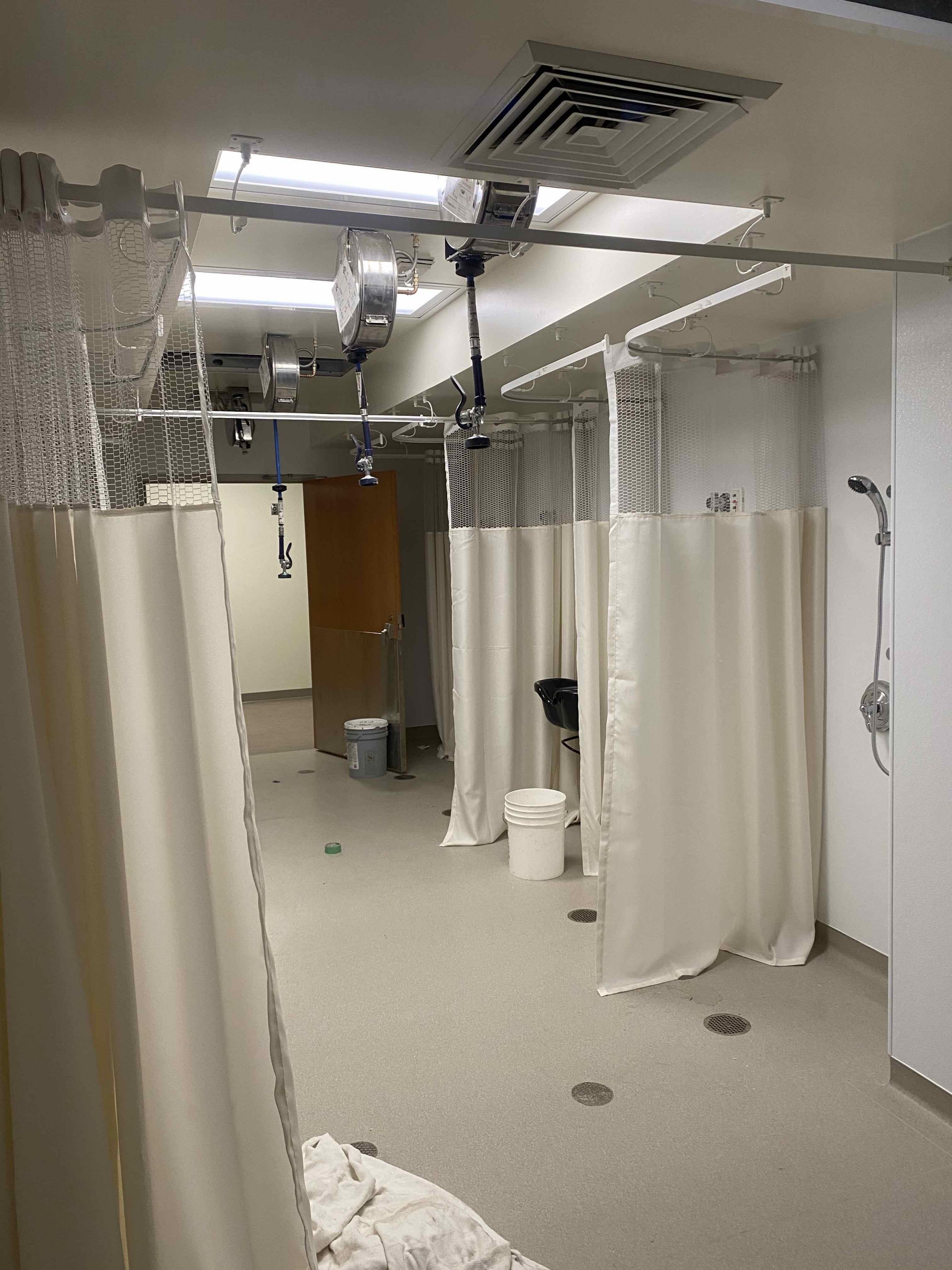 1. Two shower stations with hand-held wands and temperature controls must be provided, along with a floor drain. Water discharge from the showers must be contained inside the room, which usually means sloping the floor away from the perimeter toward the floor drains and equipping the doors with saddle thresholds.