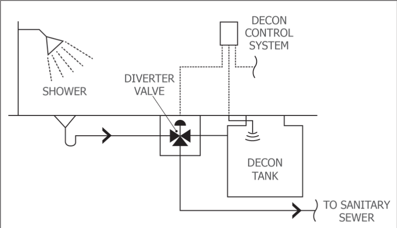 • Shower number and type. As discussed, most codes require that a decontamination area must have no fewer than two shower stations, and each must have hand-held wands and temperature controls. The codes, however, do not give any requirements on shower flow rates, leaving this decision to the engineer and the client.