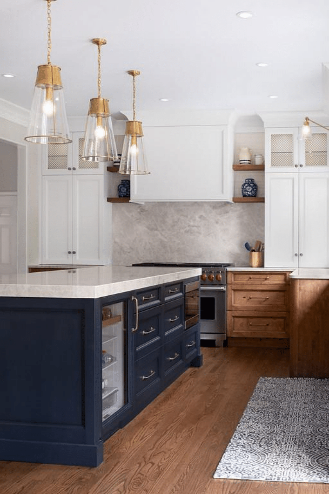 Finishes also are changing with the times. “Mixed metal finishes and materials with patterns and textures are trending,” Needler explains. “Patterned backsplash tile with bold, natural stone countertops such as Arabescato (marble), and textured surfaces such as hardware with knurling, wood-textured cabinetry, and leathered or honed countertops are trending.”