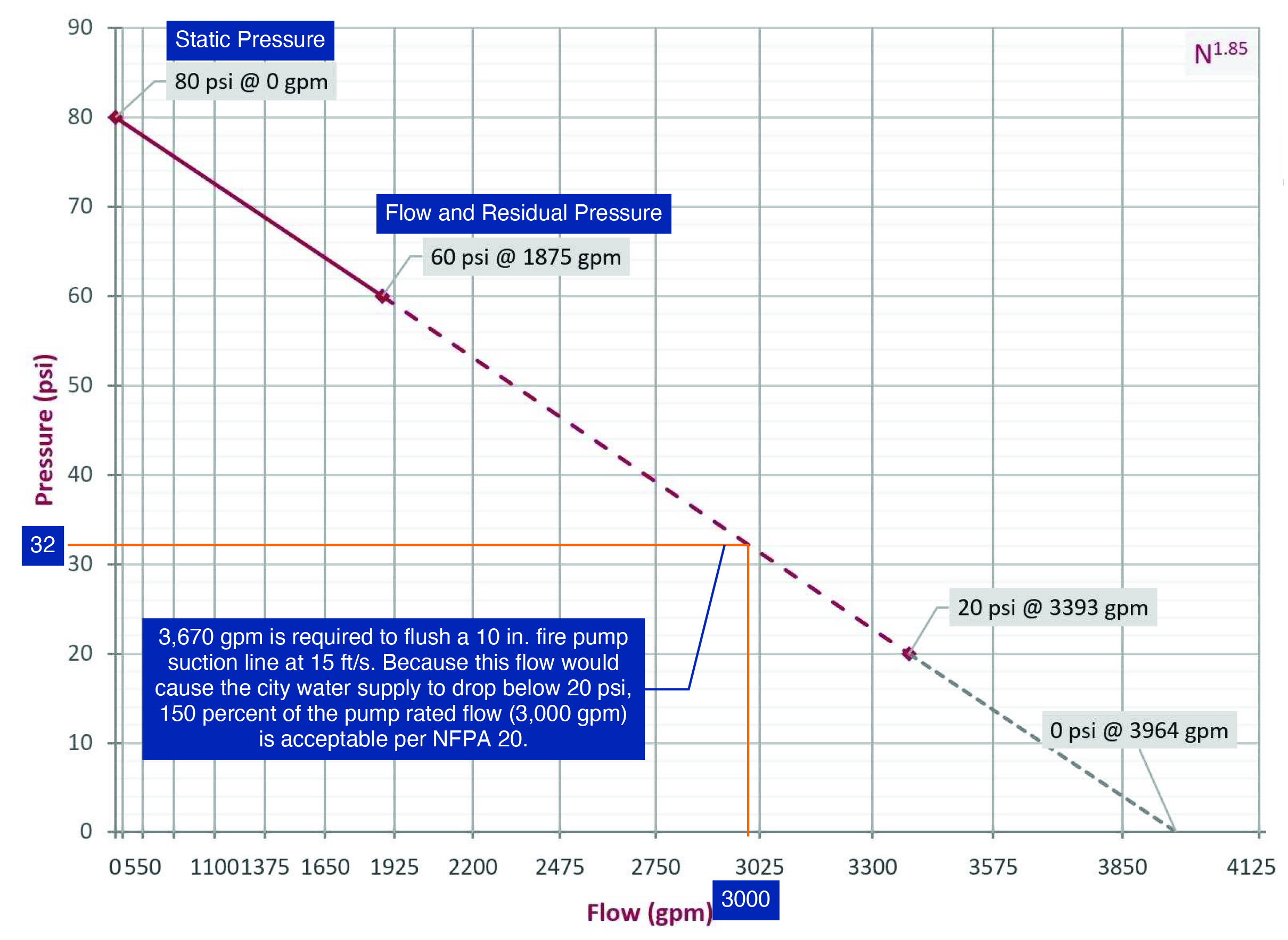 As shown in Figure 2, plotting these points linearly on an N1.85 scale graph and extrapolating the line to 0 psi provides a theoretical understanding of the flows available at any pressure along the curve. This hydraulic curve is what you will use to determine the target residual pressure for the required flow to flush the system properly.