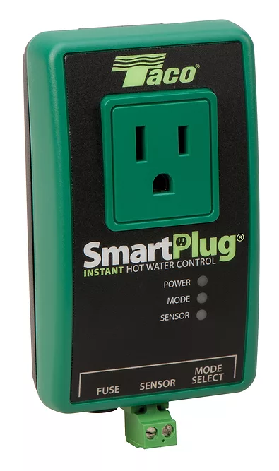 Taco’s 115-volt SmartPlug Instant Hot Water Control features technology to learn and record a homeowner’s hot water usage pattern, and employ the resulting data to operate a home’s hot water recirculation pump precisely when hot water is typically required. While hot water recirculation pumps typically run continuously or are controlled with an aquastat or timer, SmartPlug provides fully automatic and self-adjusting pump operation – only when hot water is desired. Usage patterns are monitored and recorded on a daily and weekly basis, with the SmartPlug system regularly refreshing data and adjusting any changes to hot water usage patterns. The result is a significant increase in water heater operational efficiency, promoting a simple yet notable way to save on residential energy costs.