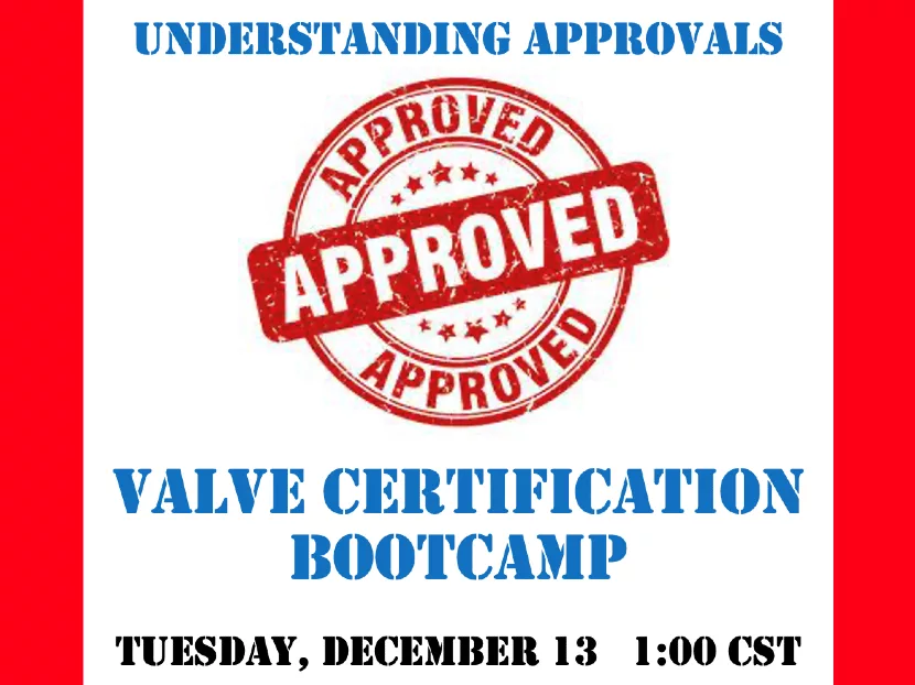 Product certifications establish that a product is approved and meets the material and design demands of an industry specification. The purpose of Valve Certification Bootcamp is to understand the value of these certifications and to better understand their relationship with product approvals.