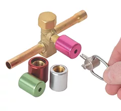 Each locking cap is color-coded for easy identification and to prevent accidental mixing of refrigerant gases. Featuring an anodized aluminum casing and a threaded brass insert, the caps are tamper resistant and can withstand the harshest weather.