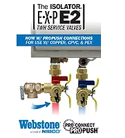 Patented Isolator E-X-P Service Valve Kits allow for quicker, consistent quality tankless water heater installations with fewer leak paths. Now available with Pro-Connect Push ends for fully removable connections to copper, CPVC or PEX. Clean, flush, or diagnose any tankless water heater with ease. Products are in stock for immediate shipment. Lead-free CleanBrass certified to meet all low lead laws and guaranteed for life.