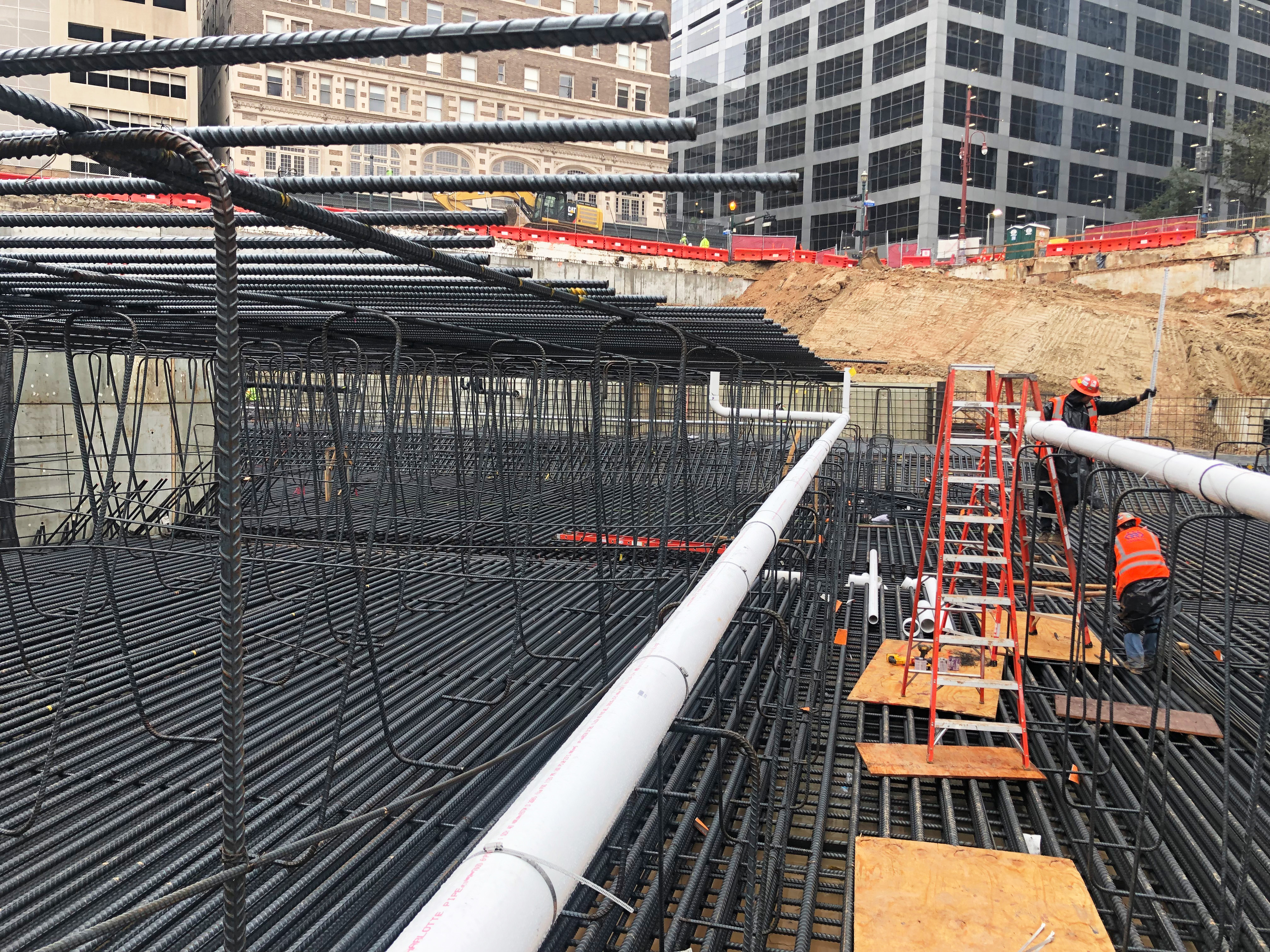 Houston’s plumbing code impacted other areas of the design and construction. For example, the city prohibits plumbing from being encased within any concrete element. However, the building’s core areas rest on 8- to 12-foot-thick concrete mat-slab construction; due to stresses beneath the slabs, the engineering team concluded that pipe trenching beneath them was ill-advised.