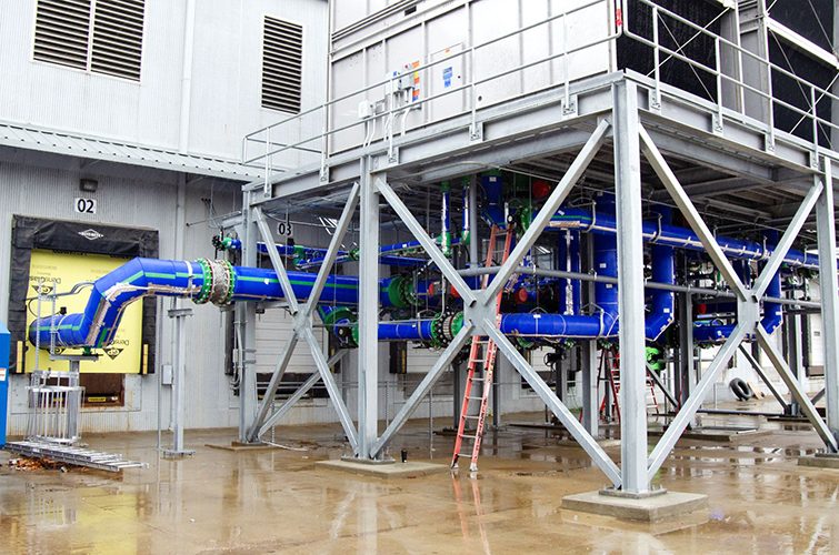 Before the production could even begin, though, the facility’s infrastructure had to be installed. In addition to the machinery that makes up the production lines, there are about 2.5 miles of polypropylene piping threaded through the 527,000-square-foot building.