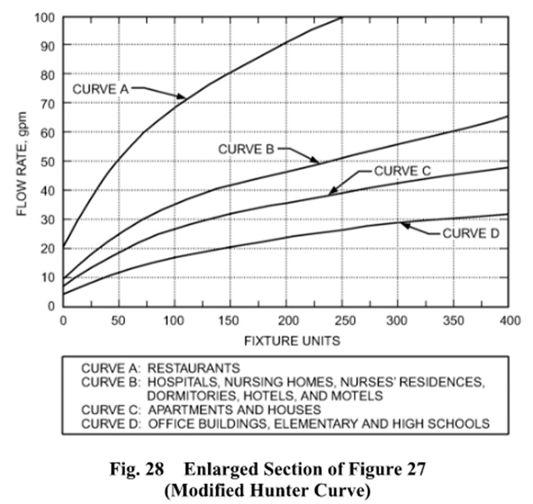 The second method we use is what I call the fixture unit method. Relative to how a designer sizes the domestic water service for a building’s potable water supply, this method uses specific fixture unit values for each fixture. The designer then sums the total fixture unit values and converts the total value to gallons per minute (gpm) by way of a modified Hunters Curve.