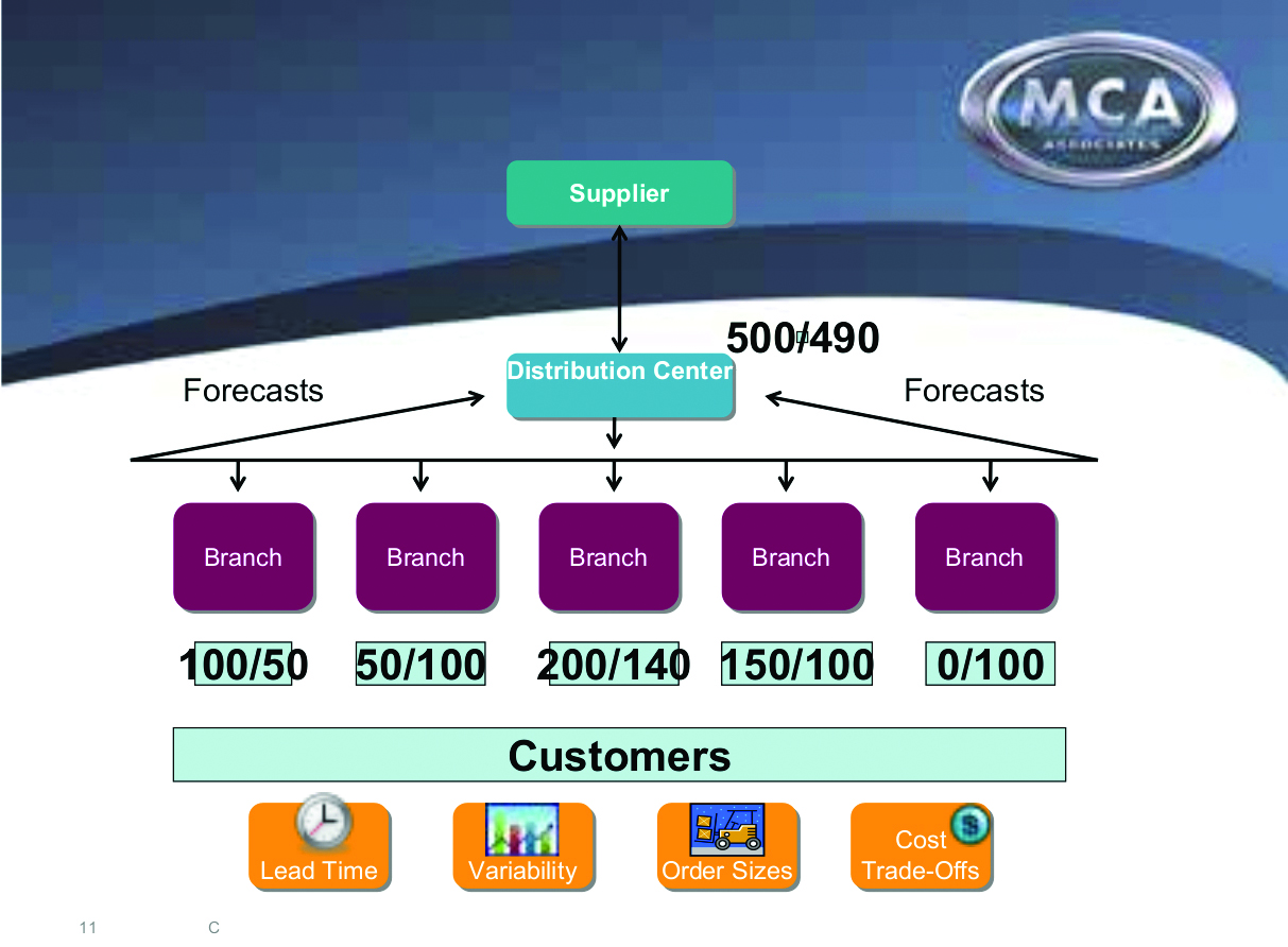 The forecast at the distribution center, when aggregated, is most often more accurate. The “fact of life,” as shown, is that forecasting is more accurate the higher the level of aggregation.