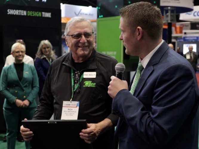 Richard Medairos, P.E., Taco senior systems engineer and commercial trainer, was presented the Dan Holohan Lifetime Contribution to Comfort Award at Taco Comfort Solutions’ press conference at the AHR Expo on Monday, Jan. 22, by Ben White, program manager, business operations of Taco Comfort Solutions.