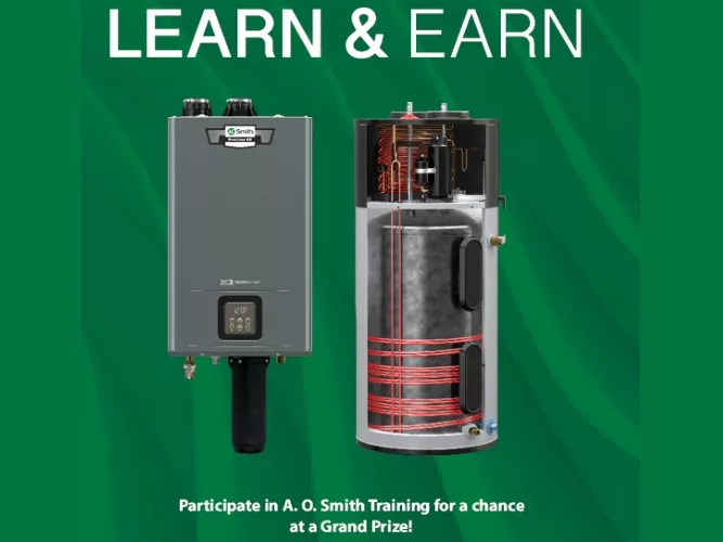 A. O. Smith, a leader in water heating and treatment, announces the introduction of the brand-new Learn and Earn training series. The set of courses rewards participants for learning the latest A. O. Smith technologies — the Voltex AL Heat Pump Water Heater (HPWH) and the Adapt Tankless Water Heater.