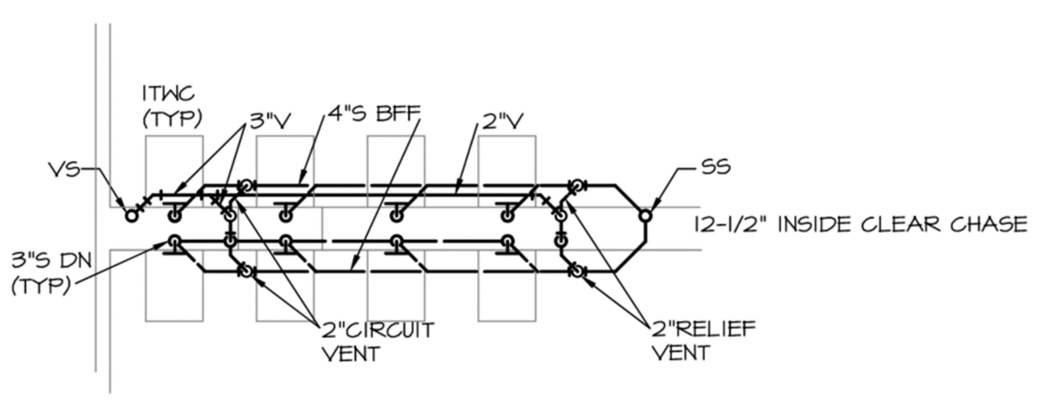 Henderson Engineers recommends a minimum of 4 inches to install the vent and pipe supports. This would require a 5-inch by 10-inch rectangular hole in the slab for the 3-inch waste fittings. This pipe penetration may not be properly fire-sealed to achieve some rated floor penetrations. A solution is to provide separate 5-inch holes 2 1/2 inches apart for each waste fitting, setting the chase width to 16 inches (Figure 7).