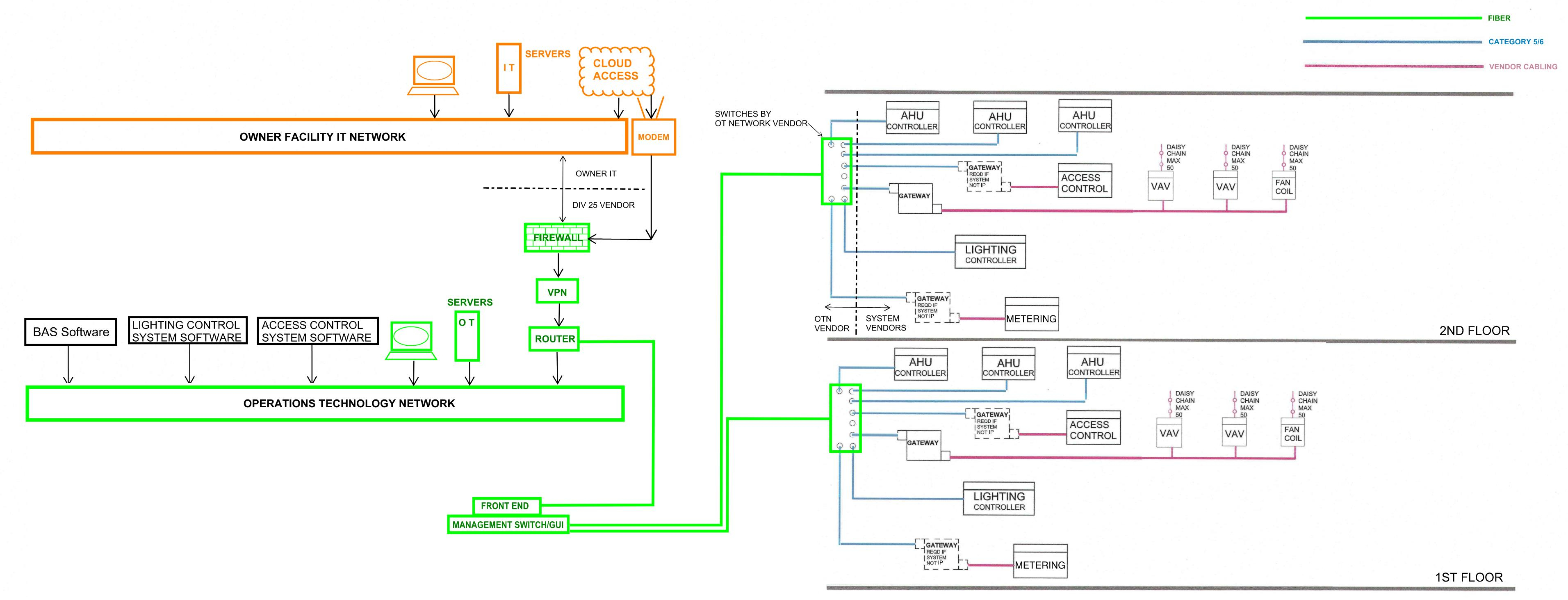 Depending on how the building operator wants to manage it, this can be combined with the IT network or standalone as an OT network. Many components comprise the full building system stack, but it can be broken down into layers for easier understanding.