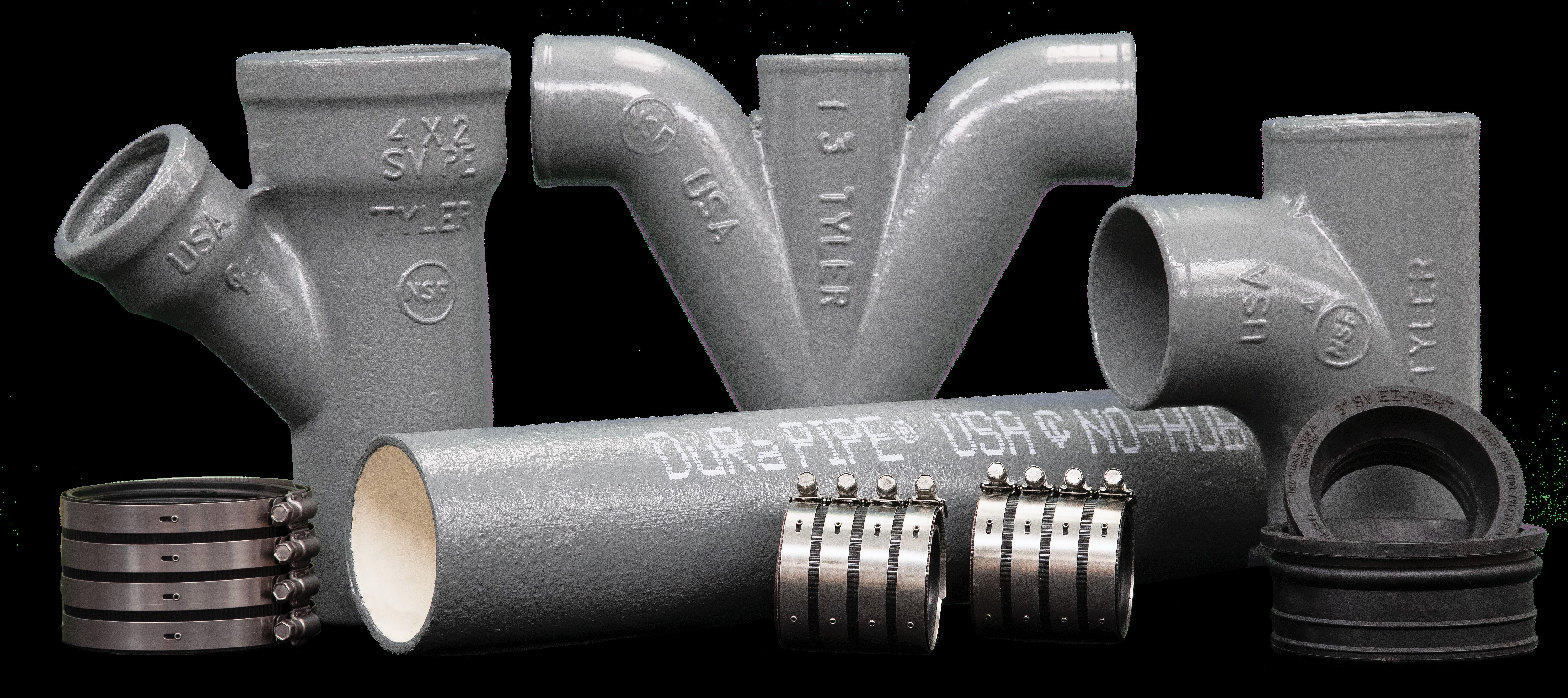 When considering new construction or sewer rehabilitation piping materials for your next project, consider enhanced epoxy-coated, cast-iron pipe by Tyler Pipe and AB&I Foundry: DuRa Pipe. Applied to cast-iron soil pipe and fittings made in the United States, DuRa Pipe is well-suited for aggressive drain, waste and vent applications where greater performance is required.