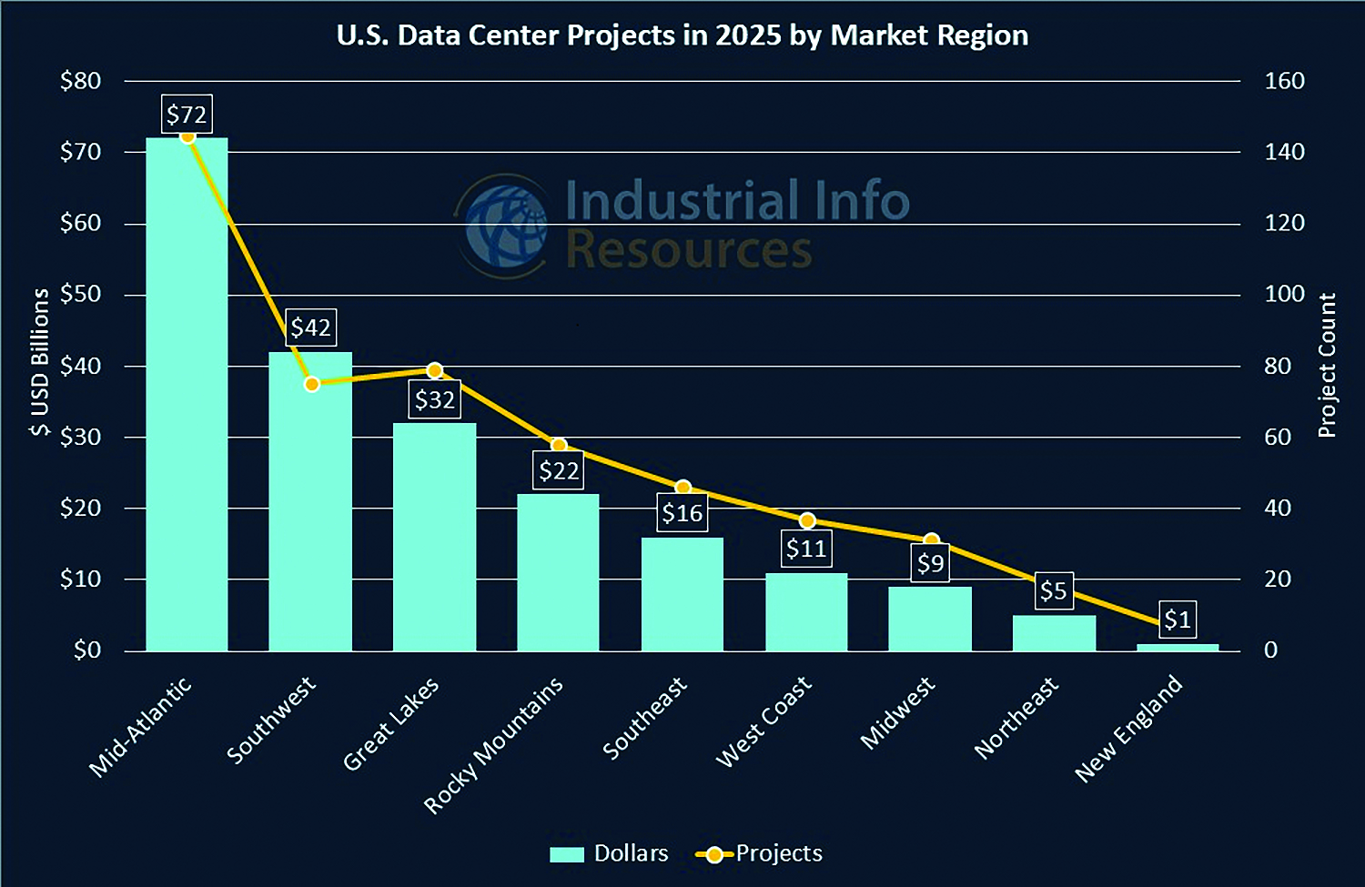 Of the industries tracked by Industrial Info, data centers currently rank third in total project spending, after power generation and mining. However, by the end of this year, data centers could be much closer to the top in spending levels, according to David Pickering, IIR’s vice president of research for industrial manufacturing.