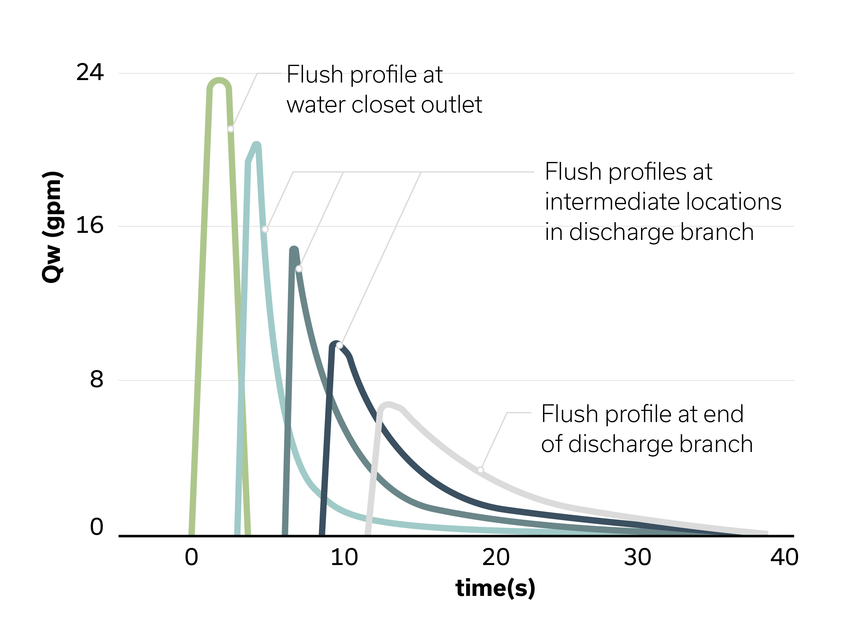 The height and velocity of unsteady flows, which describe the flow characteristics of the water closet, dissipate as the flow travels away from where the volume of water was released. Steady flows, such as those from a shower or a running faucet, will maintain a more predictable filling height along a long, horizontal drain. When a water closet is flushed, the drainage flow levels out; the burst of flow begins to transition to a shallow flow as the flush moves along the length of a horizontal drain (Figure 3).