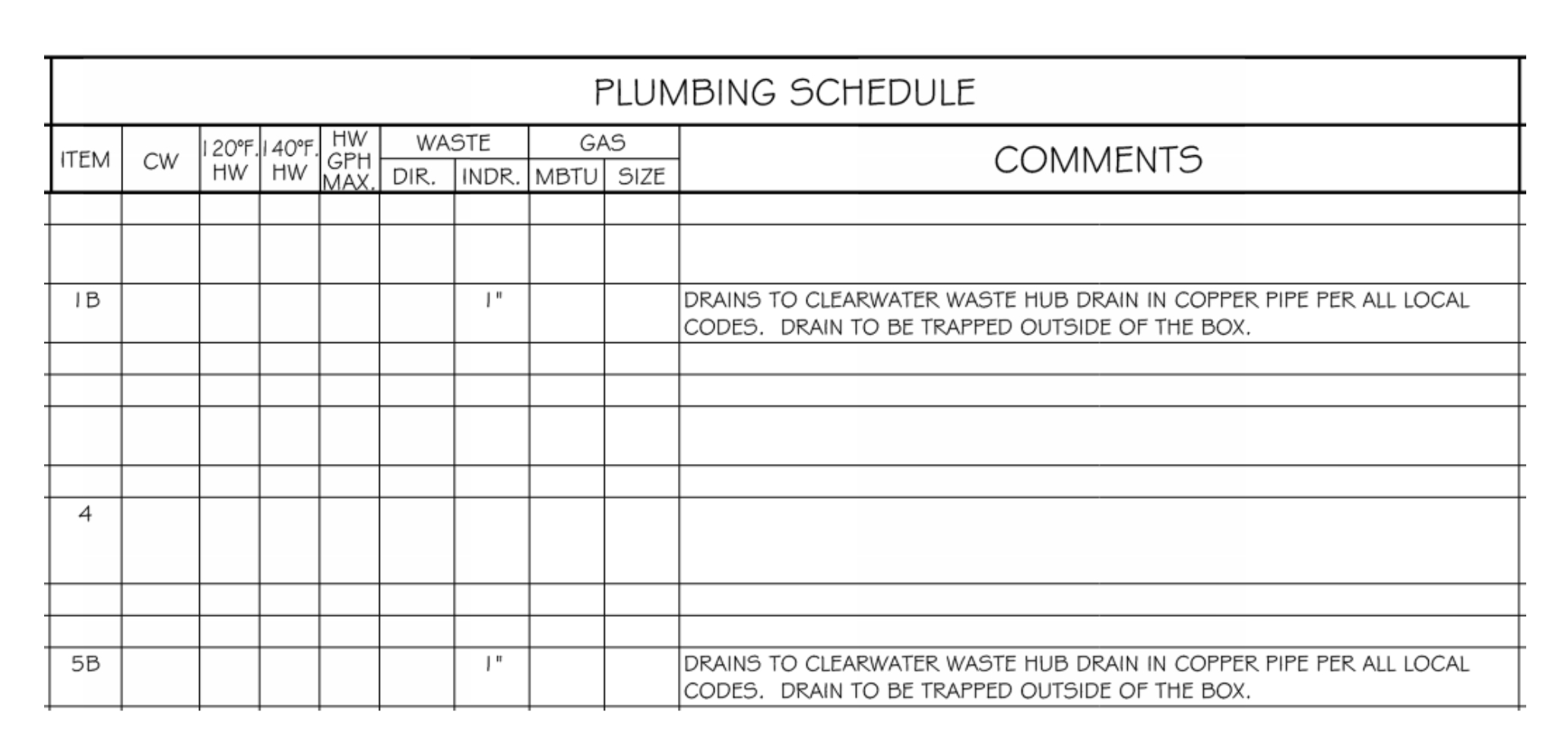 This schedule can quickly help you determine equipment requirements for pipe sizes, systems, water temperatures, what you are responsible for providing (trench and floor drains are common items), as well as other critical information for your design.