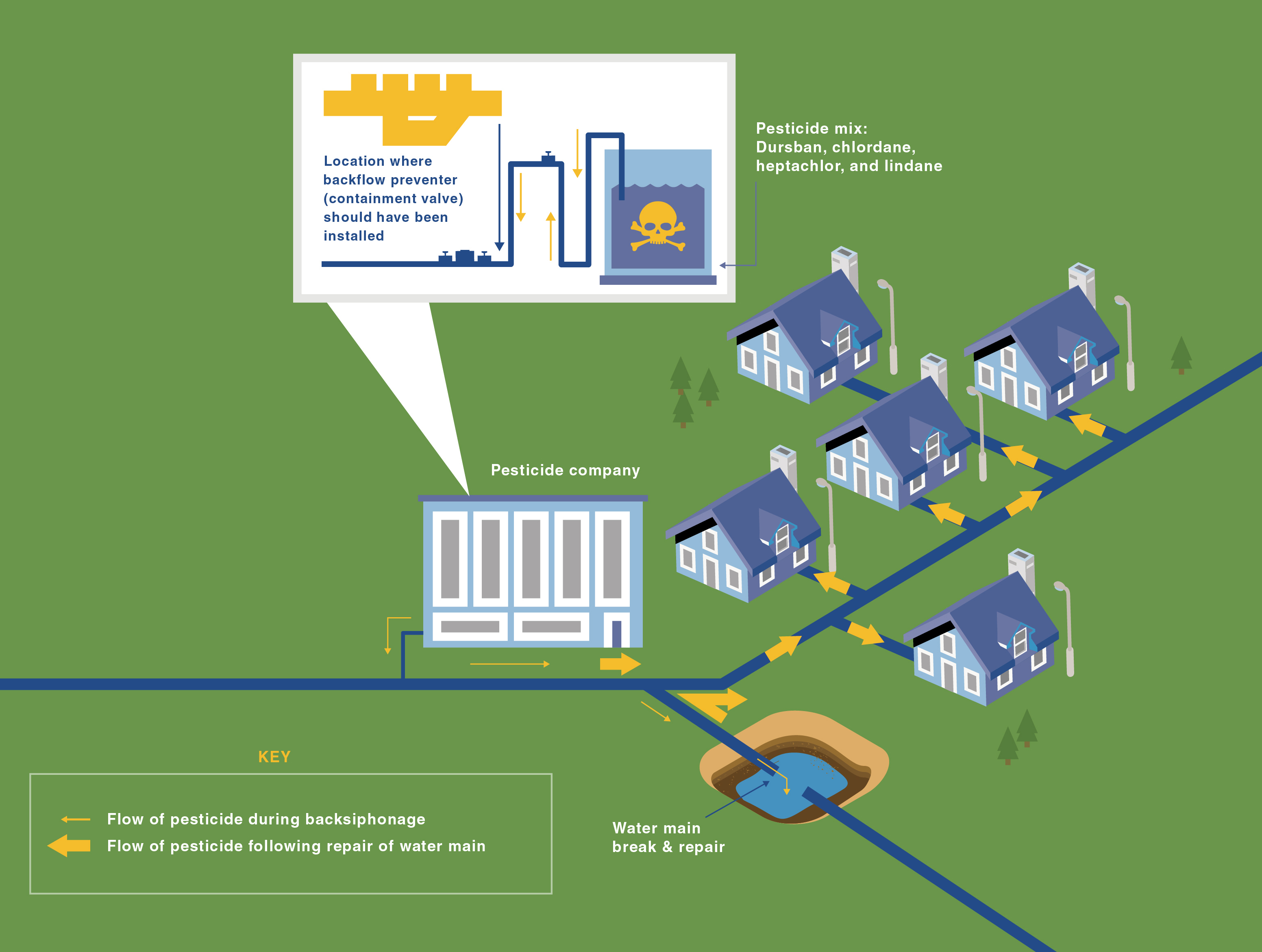 Another example: pesticides used for termite control were found in a New Jersey municipal water supply. A water main break had caused negative pressure in the distribution piping, siphoning water through unprotected cross-connections, including one at a pesticide manufacturer. Dangerous chemicals flowed into the water main over the two hours it took to repair the break.