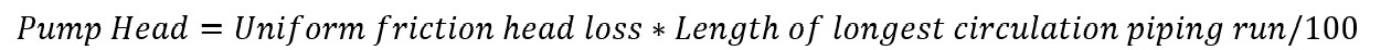 Determine the circulation pump head. Choose a value for the allowable uniform friction head loss in the circulation piping. I usually stick with 2ft hd/100ft, but it can be any reasonable value that doesn’t produce excessive velocities. Find out what the distance from the pump location to the farthest circuit or end of the piping network is. Use this equation to determine the circulation pump head.