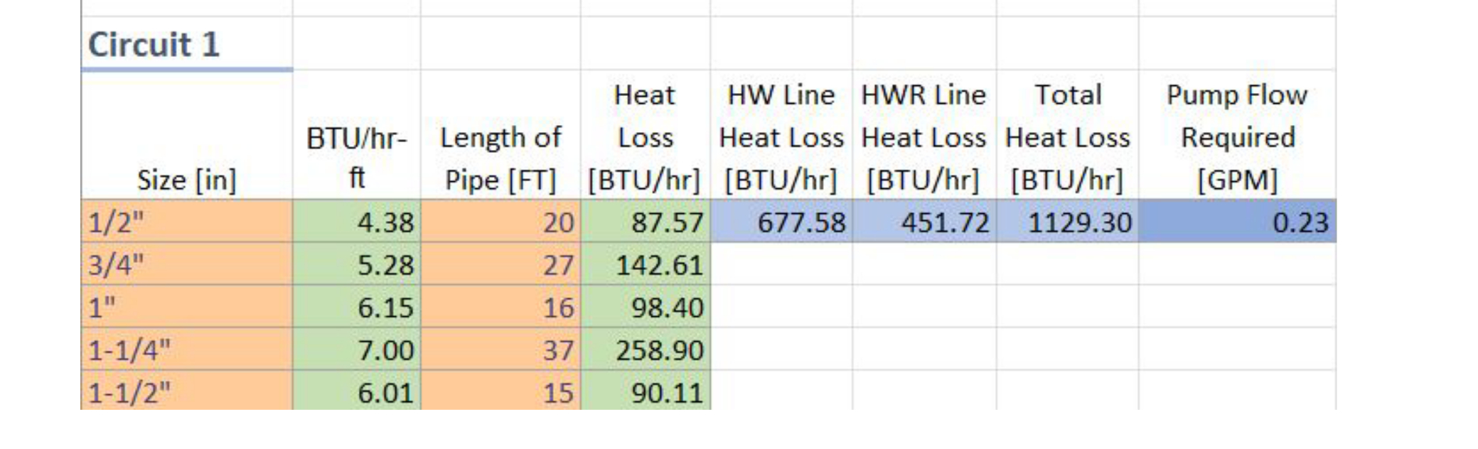 I create separate tabs in my spreadsheet, one for the mains and one for the circuits. Keeping them separate helps in a later step. Tabulate the lengths and sizes of hot water piping that are a part of each circuit or main. Using the calculation for Q in Step 1 will give a heat loss for each length of pipe. Adding these together will give the total expected heat loss in the hot water piping of the circuit or main.