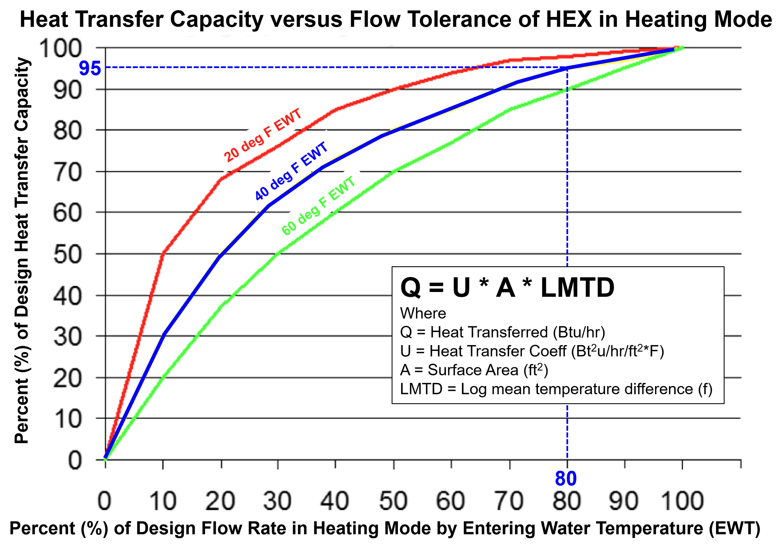 GSHPs operating in heating mode can deliver over 95% of rated coil capacity with only 80% of design flow when the entering water temperature is 40 F. This supports the use of reduced pump sizing without compromising heating performance. In cooling mode, capacity decreases only marginally — by a few percentage points — under similar flow reductions.