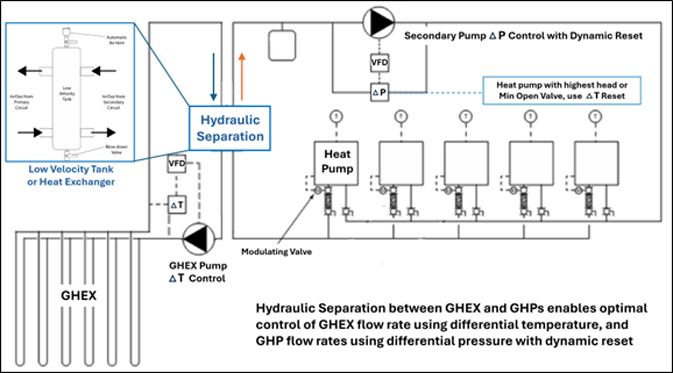 Their research confirms the optimized design approach first reflected in Energy Environmental Corp.’s (EEC) patented work beginning in 2012 and most recently, U.S. Patent No. 12,188,676. It highlights the advantages of hydraulically separating the GHEX from the GHP source circuits while applying differential temperature (ΔT) and differential pressure (ΔP) control strategies to improve thermal stability, system efficiency and overall reliability.