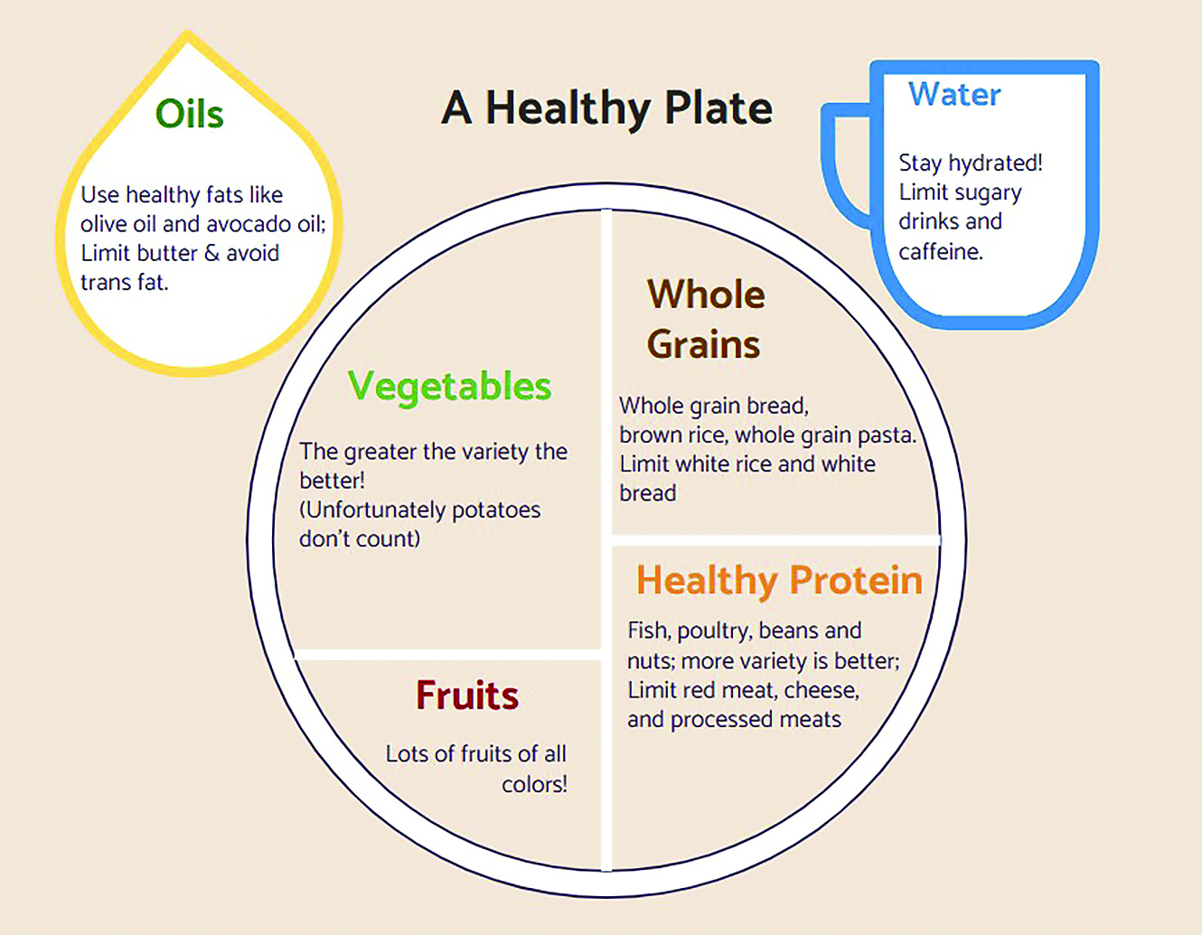 In recent years, nutritionists have moved away from using a food pyramid to demonstrate healthy balance in favor of using a plate as seen in Fig. 4. It can be easier to visualize how similar we are to the image as we load up our own plate each meal — and if we can make any changes to improve our nutritional balance. Sometimes it may mean adding an option to a meal, like pairing a side salad with a main dish; or sometimes it means finding a better balance between meals, like when we are too busy to eat a proper breakfast and take that into consideration when we plan our lunch and dinner.