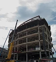 The 500,000-square-foot expansion included two leafshaped wings, designed to look like the inside of a turning kaleidoscope, featuring a five-story atrium with a 144-bed building, private rooms and sleeping accommodations for parents, a new emergency department, and retail and dining facilities. The building’s unique curvature, while visually engaging, presented unforeseen challenges for the contractor.