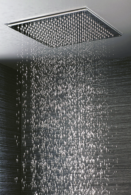 The 16" RAIN MACHINE is available in square or round with 24 finish options. This competitively priced, 1/2" IPS, all-brass fixture has 234 easy-clean rubber jets and performs well at 2.5 gpm. It can easily be installed on a ceiling drop nipple or surface mounted. A new addition to existing 6", 8", 10", and 12" models in the series.