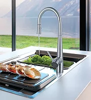 This 100% stainless steel pull-down kitchen faucet features an elegant, contemporary design with modern, arching spouts and ergonomic pin handles, and a water-saving flow rate. Resists most forms of corrosion so is especially suitable for residential kitchens in coastal areas and other wet environments, or for outdoor kitchens. At just 1.75 gpm, the steel faucet’s flow rate is below the WaterSense suggested rate of 2.0 gpm, as well as the CALGreen requested flow of 1.8 gpm.