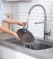 Edgewater faucets also offer effortless performance with two additional brand-exclusive features in the docking system: Re-Trax, which provides smooth operation and superior spray head retraction; and Dock-Tite, the magnetic mechanism that keeps the pull-down spray head tightly secured to the spout. In addition, the unique two-part design of each faucet handle allows only the lever portion to move, maintaining its clean design lines while providing smooth operation.