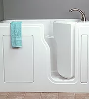 The walk-in tubs come in a 51-1/2-inch x 30-inch x 40-inch size and fit through a standard 32-inch bathroom doorway. Removable front and end panels allow easy access to the mechanics of the tub. A unique ozonator on the whirlpool and combination bath safely emits ozone into the water lines of the unit to eliminate the growth of bacteria. The units are all backed by a lifetime warranty on the door seal, a 10-year warranty on the shell and a five-year warranty on the mechanics.