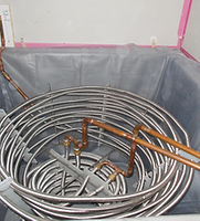 PS: There’s a solar fluid loop that includes collectors on the roof, drainback tank on the third floor, and pump and controller module, solar heat vault and heat exchanger sunk in the bottom of that tank. When the sun shines enough to heat the collectors at least 12 degrees hotter than the water at the bottom of the solar heat vault, the high efficiency pump turns on and circulates heat transfer fluid around the loop. Thanks to the large surface area of Easyflex CSST HX, heat from the collectors is efficiently transferred to the stored water in the tank. The corrugated stainless steel pipe is flexible enough to be easily wound around a custom designed stainless steel basket.