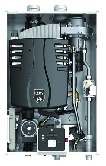 The VRC Revolution Combi Boiler is a high efficiency, condensing boiler that provides abundant heat for both space heating and DHW. One unit takes care of it all. The boiler has an AFUE of 95 percent, 10:1 turn down ratio and a self-calibration mode, which is customizing of unit operation parameters. The boiler uses existing 1/2-inch gas pipe up to 24 feet. A negative pressure gas valve provides constant performance at the low gas pressure situation. Other features include a built-in circulation pump, 2-inch PVC vent up to 60 feet (3-inch venting up to 150 feet), full stainless-steel heat exchanger construction, an exhaust gas temperature sensor for safe operation, and simple conversion to propane (LP orifice is already in the box). The environmentally friendly Low NOx combustion system is SCAQMD 1146.2 compliant. VESTA www.vestahws.com
