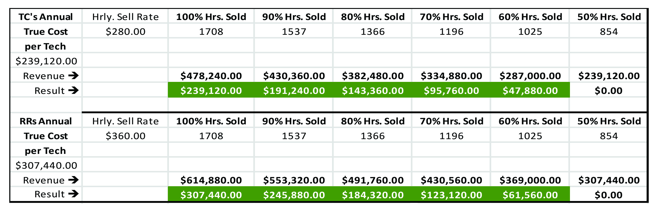 Using the low end of the aforementioned true cost to contractor range ($100), each has $170,800 annual true cost of operation ($100 x 1,708 hours) regardless of the number of hours they sell. That’s the amount of revenue they must bring in to just break even.