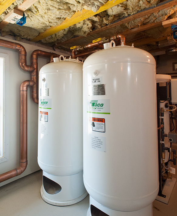 Beside these is a 120-gallon Lochinvar buffer tank and 90-gallon Taco expansion tank, each serving the load-side of the extensive hydronic system. There’s also a Taco 4900 air separator and pressure gauge, also on the hydronic system’s load side.