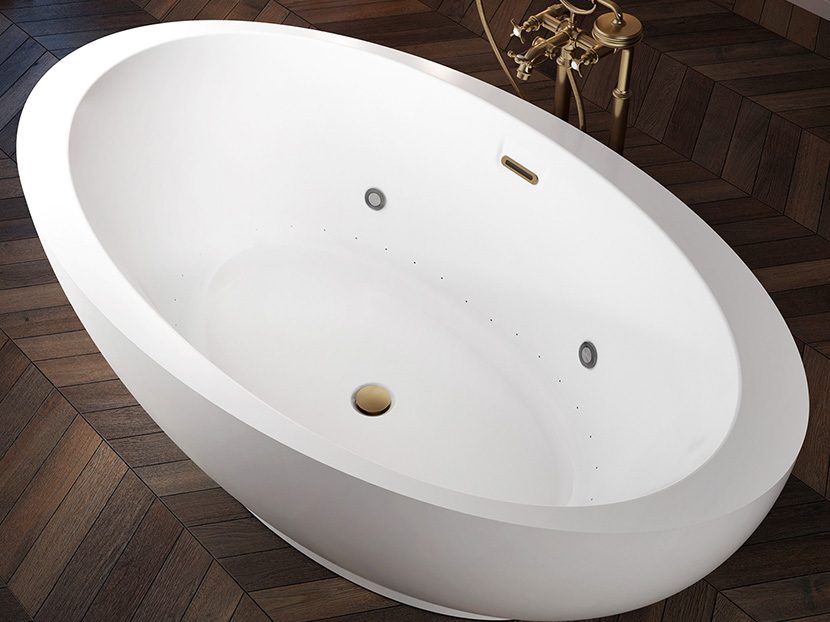 Opalia’s oval inner shell can be centered, off-centered to either side, or oblique from the center, creating an intriguing play of elliptical shapes and boldly distinctive decks. The tub measures 68 x 39 x 25 with proportions to accommodate two bathers in comfort, and comes in two finishes – Glossy or UltraVelour Matte. Crafted by hand, the tubs are made for durability.