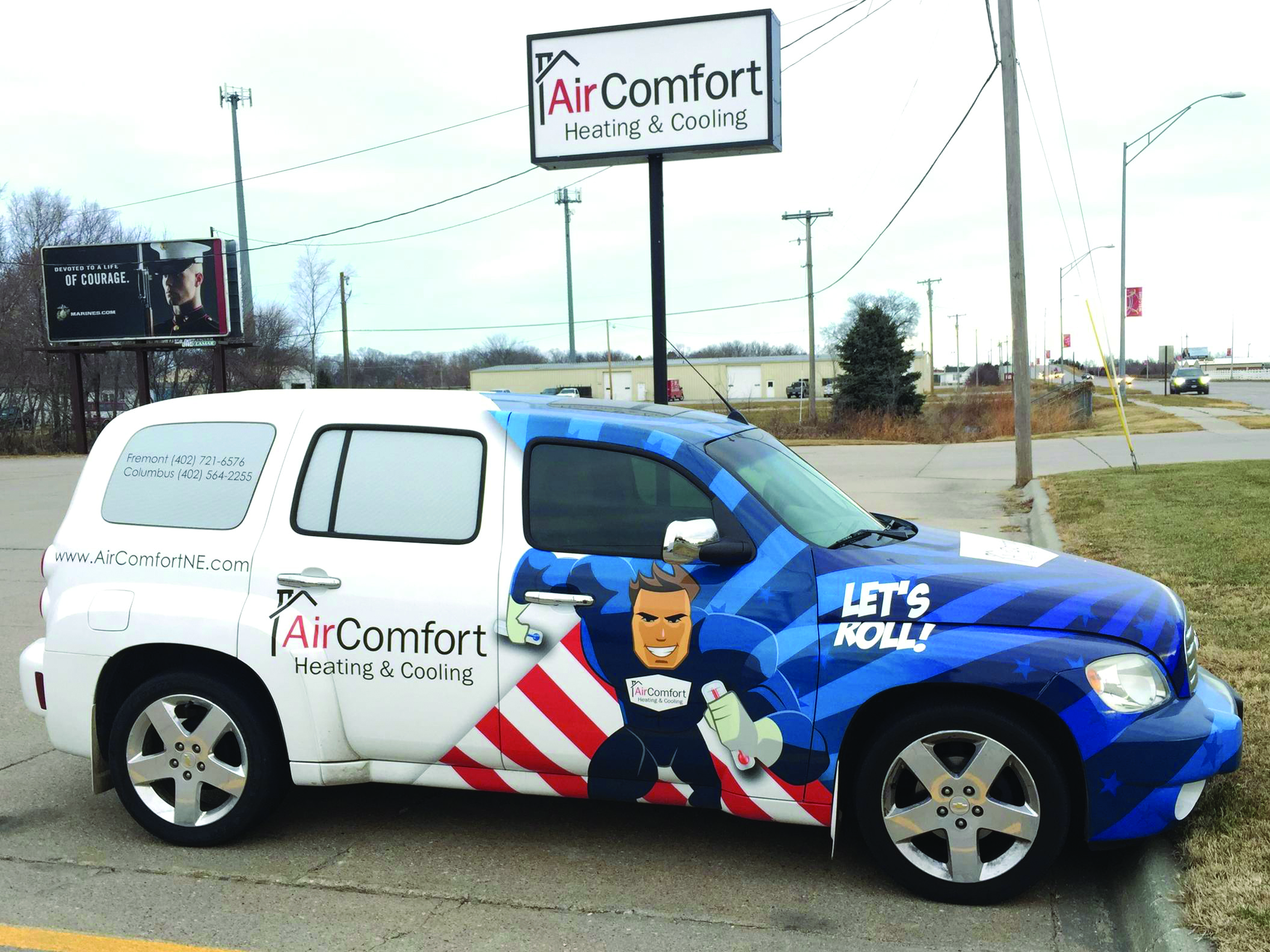 Our Air Comfort “super trucks” help us provide the best service, of every service we offer – every time. Our Comfort Advisor provides expert advice for people needing a new furnace, heat pump or air-conditioner and a 14-ft super Installer with a complete sheet metal shop inside. Since we cover a large rural area our super service trucks provide a virtual warehouse on wheels. Our ProTechs really enjoy all the attention they get; we’ve had people contact us for service simply from seeing the super truck in their neighborhood. We actually had one system get sold after a client saw the HHR driving down the highway. Kids love the ProTech superhero character and always point him out to Mom and Dad as we pull up next to them in traffic. Our motto is “Let’s Roll!” with an obvious tribute to those on United Flight 93 on 9/11. We also want to convey our rapid service response times.