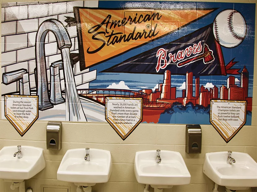 Located on the main level, these women’s and men’s bathrooms include decorative murals that celebrate the American Standard products integrated with popular baseball imagery. The illustrations, which incorporate clever factoids about water use and the ballpark, were created by artist Adam Turman, whose bold style blends elements from both storied organizations.
