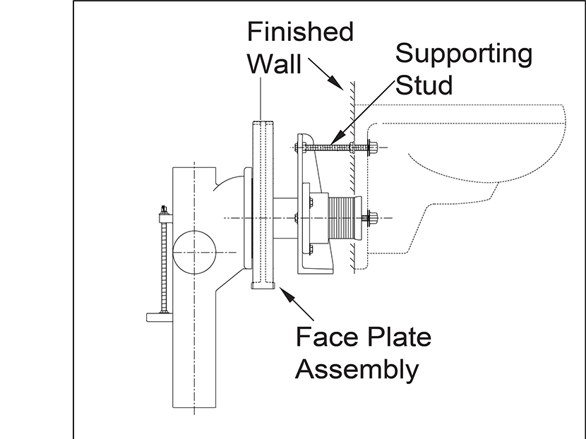 From a structural standpoint, the carrier is mounted to the flooring of the building and is piped into the horizontal or vertical drainage pipes behind the wall. It is critical that the installation procedure to mount the carrier to the floor is performed according to the carrier manufacturer’s instructions. The carrier uses four, 1-inch threaded mounting rods arranged around the outlet entrance that protrude through the finished wall. (see Figure 1). A bearing nut and washer are threaded onto the rod near the wall that provide a mounting surface for the closet. The washer should always have a small gap approximately 1/16-inch to 1/8-inch from the finished wall. These should be located so that all fall within the same vertical plane and the top of the closet is level. The backplate of the closet has four, 1-inch diameter mounting holes that these rods pass through during installation and rest against the washers. Four closet cap nuts included with the carrier are screwed onto the rods to hold it in place. A final bead of caulk is then applied around the perimeter of where the backplate meets the wall for a clean finished look.