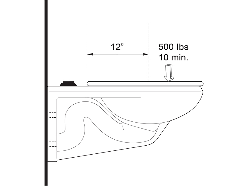 The relevant section regarding loads is Section 11 – Strength and Deflection. Sub-section 11.2 and Table 2 describe the test parameters required to pass. For wall-mounted closets a vertical static load of 300 pounds is applied 23 inches from the front of the carrier faceplate. The top surface at the furthest point away from the carrier faceplate may not deflect vertically more than 0.375 inches and the forward horizontal deflection of the top rear portion of the fixture backplate may not deflect more than 0.125 inches. If the carrier withstands the maximum static loading without failure, permanent distortion, or deflection in excess of those described, it is considered to have met the requirements. Note that this static load rating for carriers is 200 pounds less than the load requirements for the fixtures they are intended to support. Depending on the carrier manufacturer’s own specifications, it is entirely possible that the carrier is the determining factor of whether a failure may occur during use.