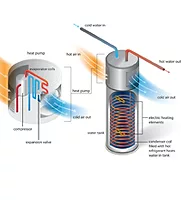Using the same technology as a refrigerator, a HPWH transfers heat from surrounding air to the water in the tank — producing cool dry air along with hot water (see diagram showing the heat pump, which sits atop the water tank). During periods of high hot water demand, HPWHs switch to standard electric resistance heat — which is why they are often referred to as “hybrid” hot water heaters (see diagram showing both the electric heating elements and hot refrigerant lines in the water tank).